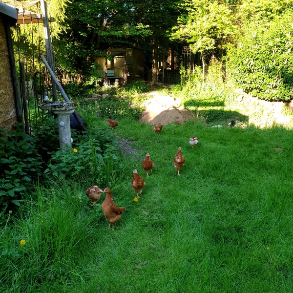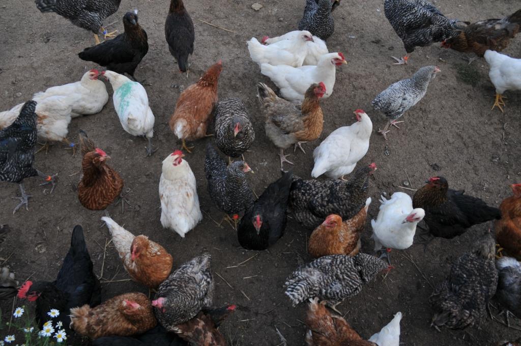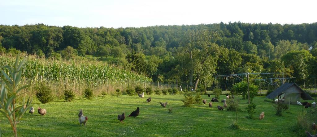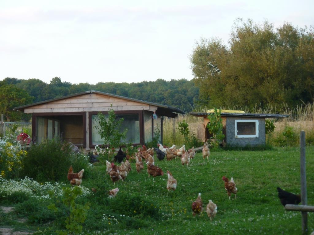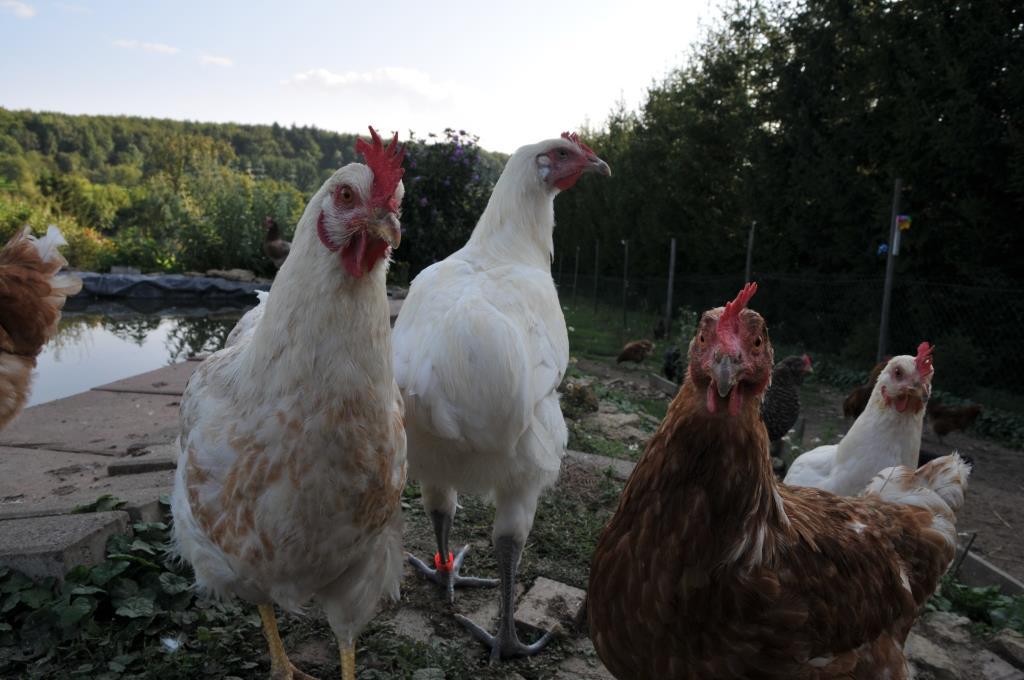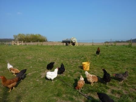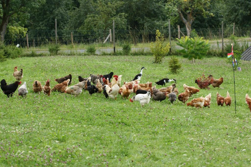 Unsere Hühner stammen überwiegend aus eigener Zucht. Wie es von der Natur vorgesehen ist, lassen wir unsere Hühner brüten und ihre Jungen im Freilauf groß ziehen. Die Hühnerfamilie besteht aus verschiedenen Rassen, so dass Eier unterschiedlicher Größe und Farbe in der Packung sind. Unsere Hühner bewegen sich auf einer Weide ohne Kunstdünger, die immer grün und insektenreich ist, somit finden sie immer frisches, vitaminreiches Futter, das nicht belastet ist. Zusätzlich bekommen sie Weizen, Mais, Reis und Haferflocken als Standard-Futter, das ständig zur Verfügung steht. Sie haben einen sehr großen Auslauf, einen immer sauberen Stall mit Einstreu aus Holzspähnen, Heu und Stroh und einen Sandkasten zum Baden um Parasitenbefall zu vermeiden. So, wie es bei Großhändlern üblich ist, wird die Gabe von Antibiotika und sonstigen Medikamenten überflüssig.